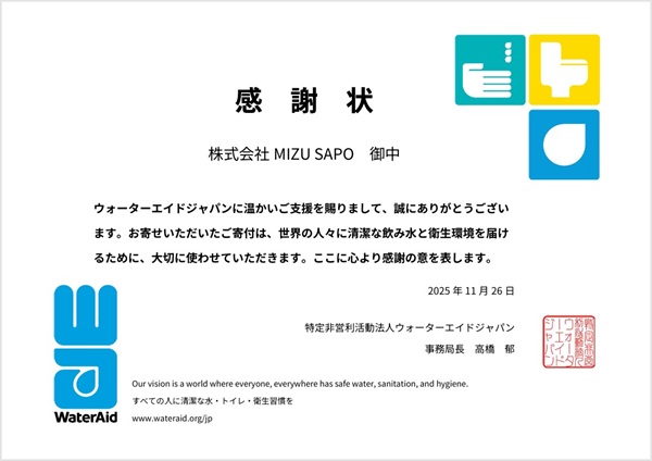 2025 年 11 月 26 日 ウォーターエイドジャパンへ寄付したことをご報告いたします。