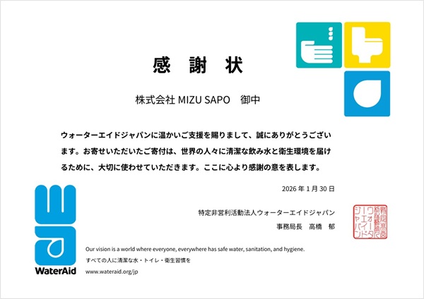 2026 年 1 月 30 日 ウォーターエイドジャパンへ寄付したことをご報告いたします。